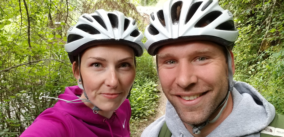 Your hosts on this quest to discover more about all the outdoor activities in the Blue Mountain region, Gwen & Steve Dildine. This photo was taken after Gwen completed her inaugural mountain bike ride. Her smile reflects the fact that her collarbones are still in one piece. Steve is far more gifted on two wheels, but the two offer a balanced perspective of trail difficulty.