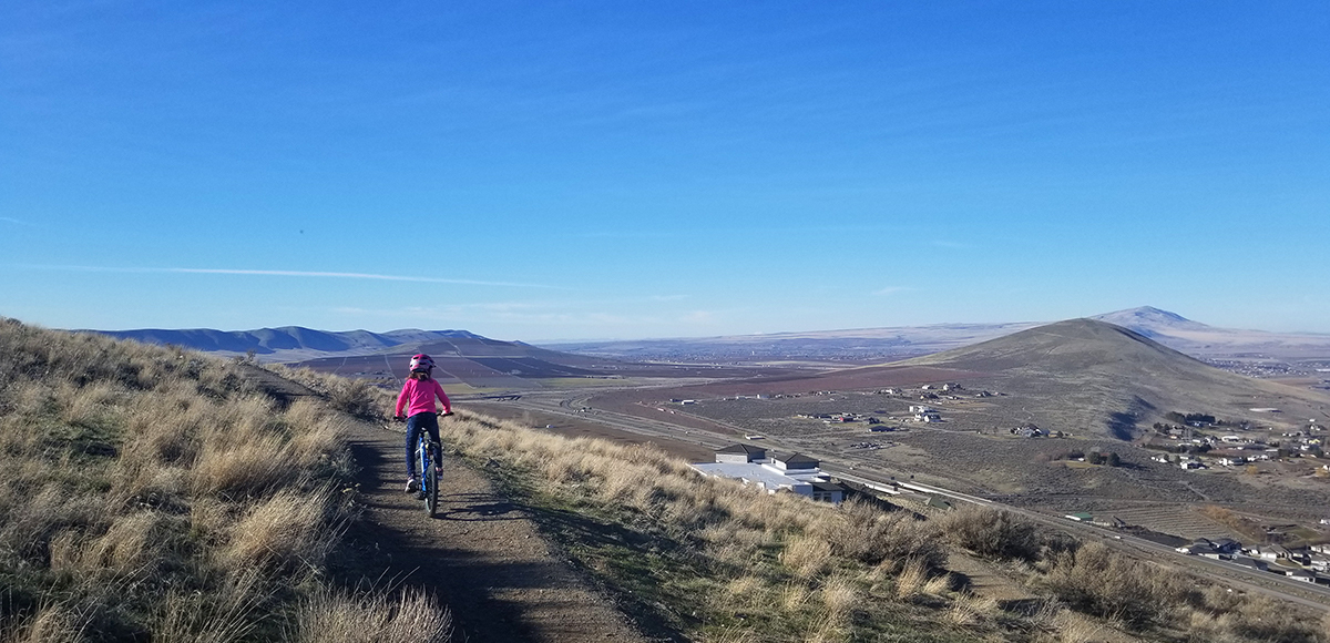 Four crushed rock based trails interconnect around Badger Mountain Centennial Preserve. These trails are meant for leisure riding to enjoy big views and nature, not for high speed downhill racing. Please respect the “No Skid” signs. Visit the Friends of Badger Mountain trail page for detailed maps, descriptions, and rules.