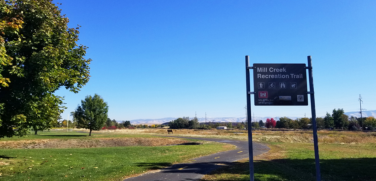 Eastgate Lions Park: From downtown Walla Walla take Rose Street east. Rose Street with make a bend to the right and continue as East Isaacs Avenue for another 1.5 miles. Turn right on North Wilbur Avenue and take your first left onto Tacoma Street. The parking lot is at the end of the road on the right. The access to the Mill Creek Recreation Trail is at the south end of the parking lot in between the baseball fields. There is signage that designates trail access.