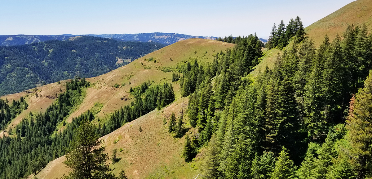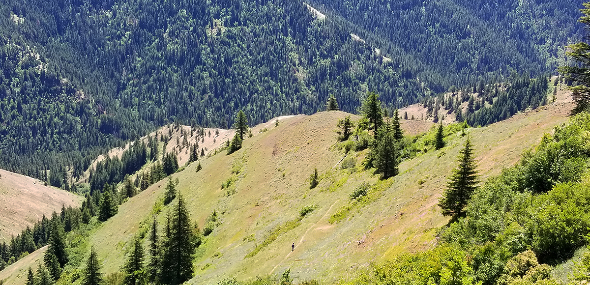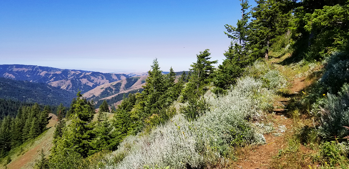 The North Fork Umatilla River Trail (#3083) is 9.8 miles one-way and ends at Coyote Ridge Trailhead (upper trailhead). The lower trailhead is accessed via the day-use area across from the Umatilla Forks Campground . If starting at the lower trailhead, expect the first four miles to follow the North Fork of the Umatilla River with minimal elevation gain. This is the most ideal option for a young family or inexperienced hiker as the remainder of the trail gains 2,000 feet of elevation. Don’t discount the Coyote Ridge Trailhead as a starting point, though, as there is a spectacular viewing area with picnic table not far from the trailhead, and the switchbacks are quite manageable.