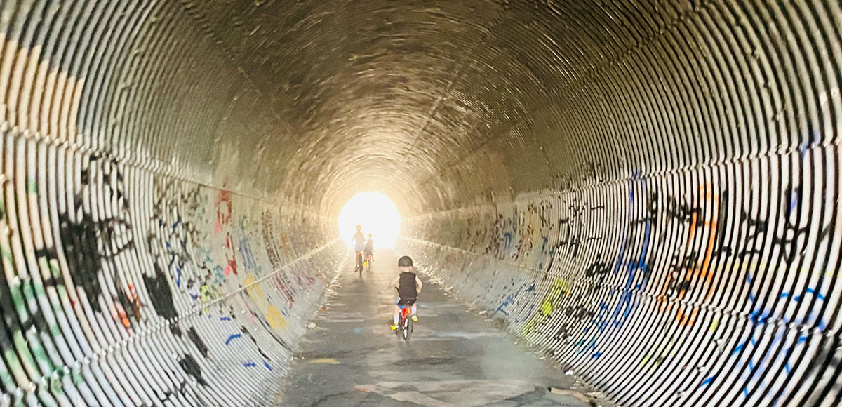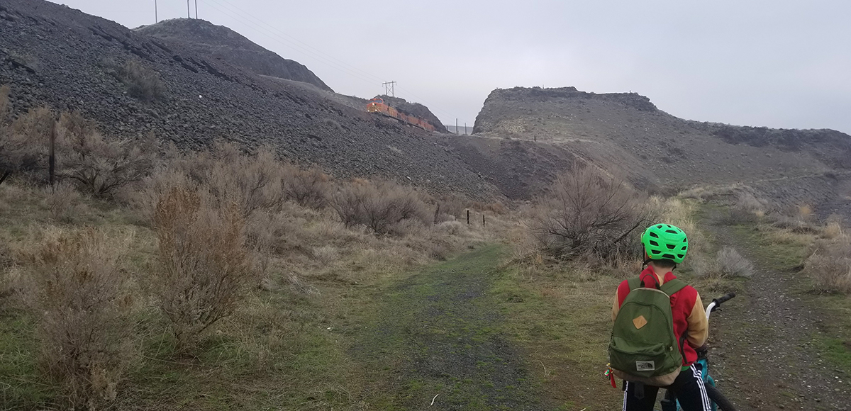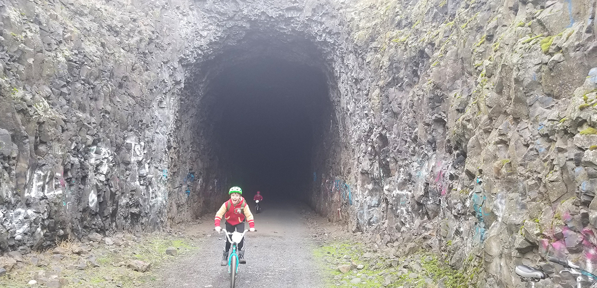The first half of the trail is wide and mostly gravel, passing through two tunnels. The first is a small corrugated tunnel under the I-82, and the second is an old train tunnel through basalt rock roughly 100 yards in length. The tunnel’s end is visible upon entry, but it is quite dark so bring a source of light.